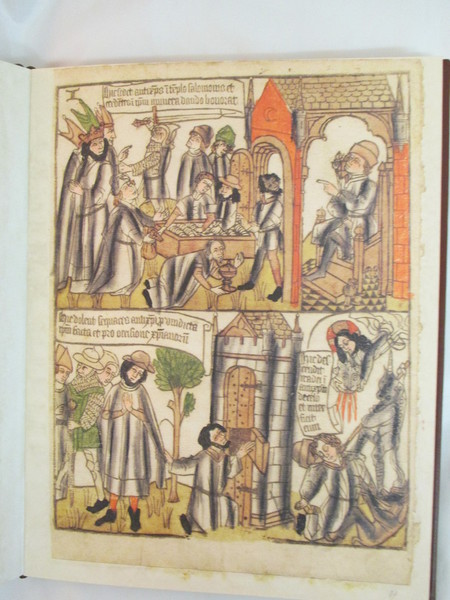 Miniaturen: 4 ganzseitige Holzschnitte und 44 Blätter in zwei Hälften geteilt, die je zwei verschiedene Szenen zeigen