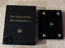 Einband: Luxusbindung in Echtleder mit acht Eckbeschlägen, zwei goldenen Schließen und punziertem Goldschnitt, in einer edlen Schmuckkassette Abnehmbares Kreuz mit