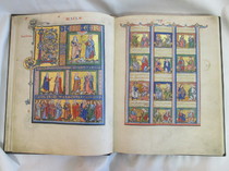 Miniaturen: Einleitend zu jedem Evangelientext befinden sich 2 ganzseitige Miniaturseiten; eine Seite ist jeweils in 12 kleinere Bildfelder unterteilt, die die Legende des