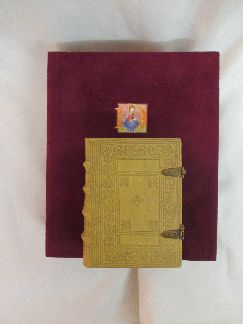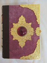 Einband: Tiefrote, dem Original entsprechender Duchesse-Naturseide. Vergoldete Beschläge und Schließen nach der Silber-Email-Buchhülle für die Handschrift.