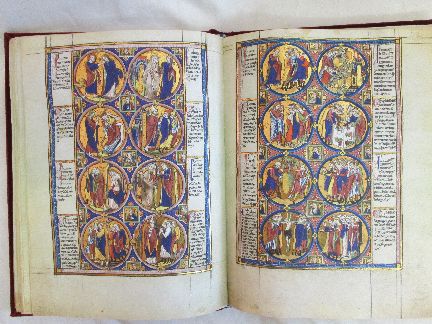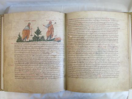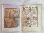 Miniaturen: 64 Prunkseiten, 16 ganzseitige Miniaturen und Schrifttafeln, 4 Portraits der Evangelisten, hunderte von kostbaren Initialen, der gesamte Text ist mit Goldtinte verfasst.