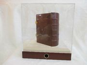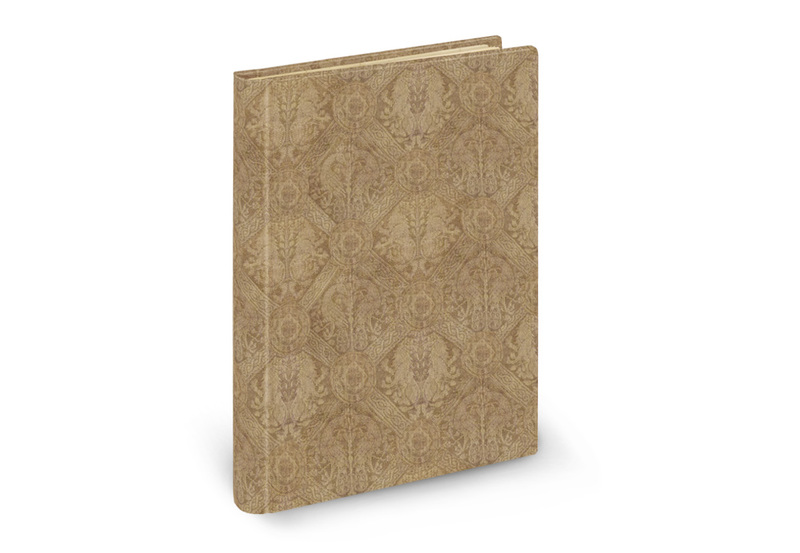 Einband: Matt schimmerndes Gewebe aus Halbseide, das prachtvoll mit Tier- und Pflanzenmotiven gemustert ist, in einer Präsentationskassette aus Acrylglas