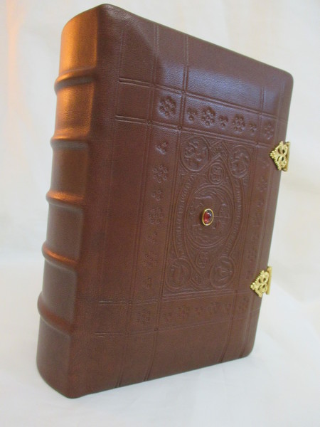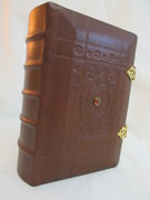 Einband: Brauner Ledereinband mit Schmuckstein und vergoldeten Schließen