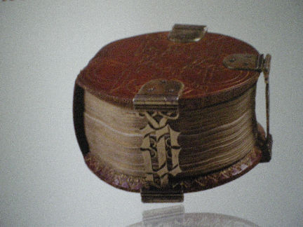 Einband: Vorderseite: Prunkeinband mit Elfenbeinrelief, Edelsteinen und Perlen. Rückseite: Seidenbezogen und mit 5 vergoldeten Beschlägen ausgestattet.