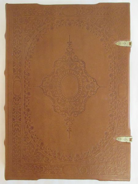 Einband: Lederdecke mit exakt vom Original abgenommener Prägung, Handheftung auf vier echte, erhabene Bünde, handumstochenes Kapital, 2 Metallschließen