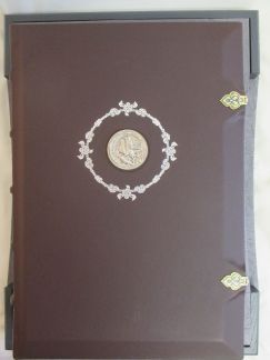Einband: Brauner Ledereinband mit Schließen und Emblem in Schmuckkassette
