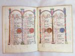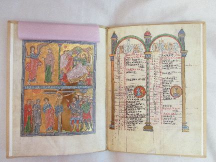 Am Anfang des Codex stehen auf 19 Blättern 19 architektonische, künstlerisch ausgestaltete Canones- Bögen, die der Evangelienharmonie des Eusebius aus dem 4. Jahrhundert als rahmen dienen Klein Blatt gleicht im prachtvollen Dekorum dem anderen, keine der farbenprächtigen Säulen ist mit einer anderen identisch.