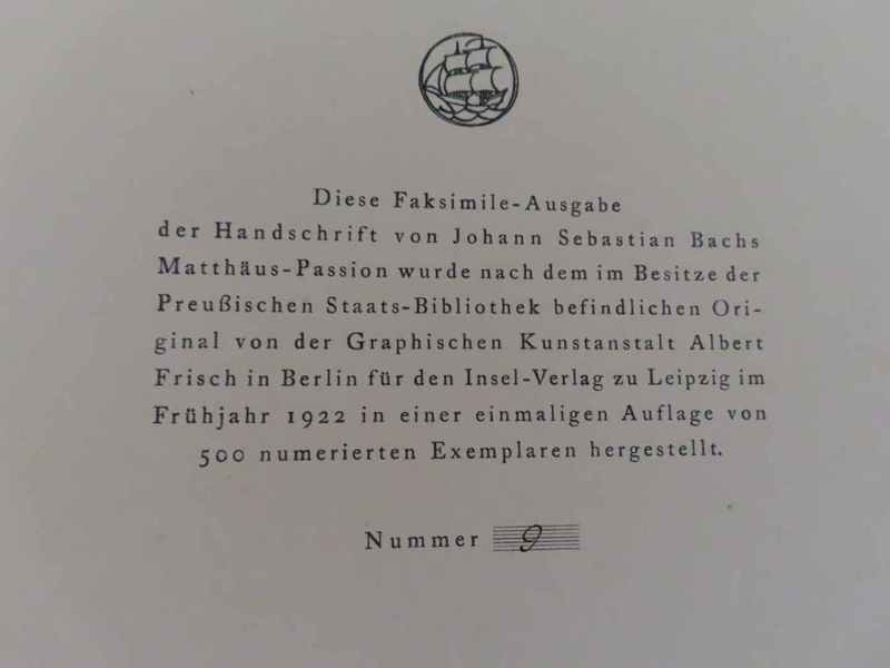 Diese Faksimile-Ausgabe der Handschrift von Johann Sebastian Bachs Matthäus - Passion wurde nach dem Besitze der Preußischen Staats-Bibliothek befindlichen Original von der Graphischen Kunstanstalt Albert Frisch in Berlin für den Insel-Verlag zu Leipzig im Frühjahr 1922 in einer einmaligen Auflage von 500 numerierten Exemplaren hergestellt.