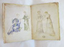 Einband: Der Einband ist eine getreue Nachbildung des Originaleinbandes aus steifem Karton. Eine Umschlagtasche aus feinstem rotbraunem Velours dient als Schutz des Musterbuchs. Die