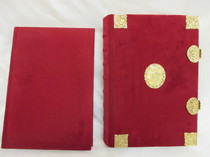 Einband: Bordeauxroter Samteinband mit einem Jadestein auf der Vorderseite, in edler Kassette.