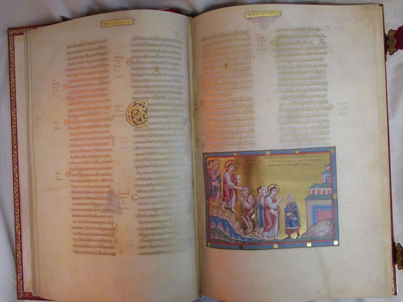 Miniaturen: 64 Prunkseiten, 16 ganzseitige Miniaturen und Schrifttafeln, 4 Portraits der Evangelisten, hunderte von kostbaren Initialen, der gesamte Text ist mit Goldtinte verfasst.