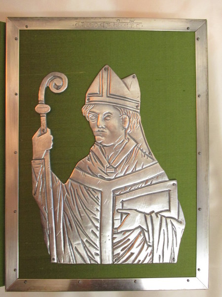 Metallplatte, dessen Vorbild eine Darstellung Egberts auf dem Mettlacher Kreuzreliquiar liefert, sein einzig erhaltenes Porträt auf einer Metallplatte.