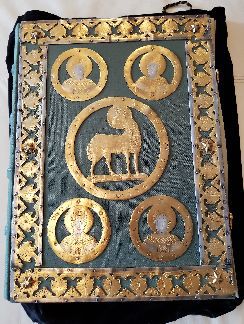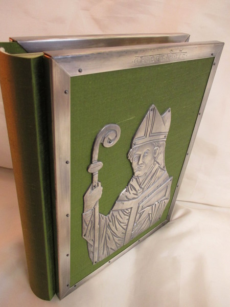Einband: Der Einband aus grüner Seide ist einem typischen Bucheinband aus ottonischer Zeit nachempfunden. Den Vorderdeckel ziert eine fein gearbeitete, versilberte und patinierte